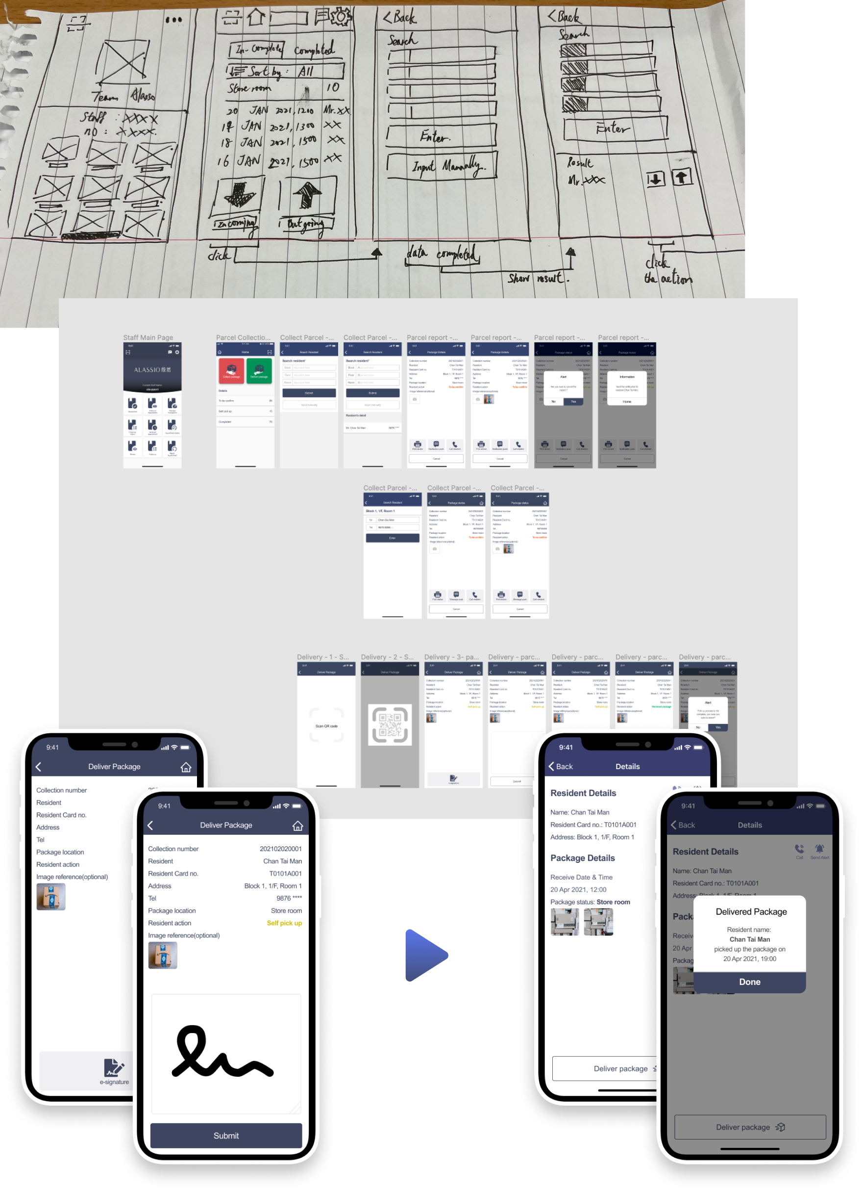 There have to highlight when sketching prototype for staff side. 1. Security problems: understanding people concern their package safety... to solve that problem, staff need to make photo reference when they store the packages and send the notification after. 2. There have a e-signature process for resident confirmation, but when testing out in the mock up. Interviewees are not refuse to sign it, because of privacy problem. Eventually, e-signature has to erase at a result.